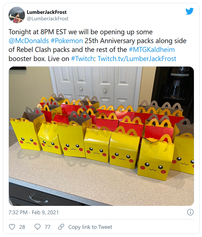 Cette année 2021 marque le 25e anniversaire de la licence Pokémon. La célèbre franchise nippone compte bien multiplier les événements pour marquer le coup, en commençant notamment avec le retour des cartes Pokémon dans les Happy Meal de chez McDonald's. Des jouets destinés aux enfants qui font toutefois le bonheur de leurs aînés. Et comme chaque produit estampillé Pokémon, sa valeur devrait grimper avec le temps, attirant au passage une ribambelle de scalpers. Après s'être penché sur les consoles next-gen, voilà que ces intéressés du profit facile et rapide se tournent vers les menus enfants de la célèbre chaîne américaine.
