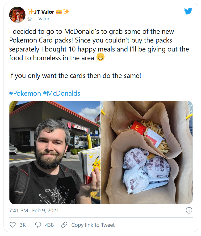 Néanmoins, certains profitent de leur passion pour ces cartes Pokémon pour aider les plus démunis. Ainsi, un twittos du nom de @JT_Valor s'est rendu dans un restaurant pour y acheter des cartes, avant de donner les 10 Happy Meal aux sans-abris du coin. Concernant la France, les aficionados du Happy Meal pourront se contenter de coloriages Schtroumpf et de livres sur les dictons de la langue française. De plus, McDonald's France vient d'annoncer un changement majeur pour son Happy Meal, les enfants autant que les adultes risquent bel et bien de pleurer à chaudes larmes.