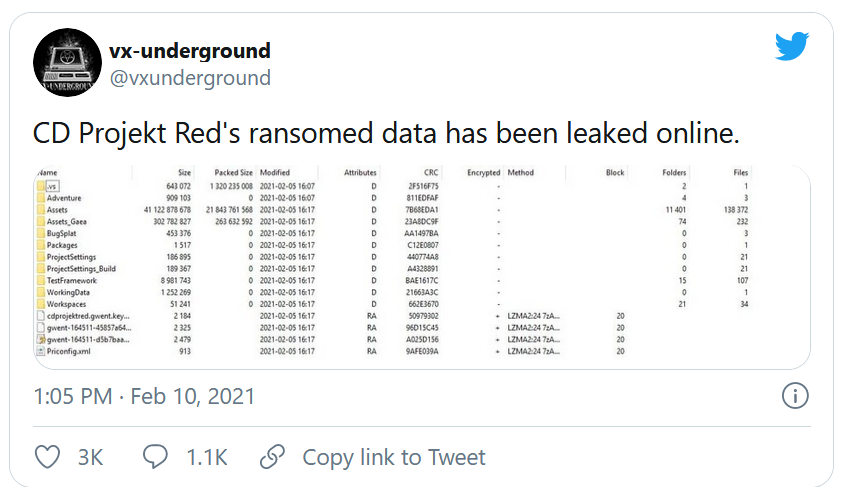 La demande de rançon indiquait que le studio CD Projekt Red avait jusqu'à 48h pour prendre contact avec les hackers. Etant donné que le studio n'en a rien fait, une vente aux enchères a débuté sur le net. Les hackers, pour attester du fait qu'ils aient bien en leur possession les données des jeux, ont fait fuiter quelques lignes de code sur internet, comme le révèle sur Twitter le compte de cybersécurité vx-underground :