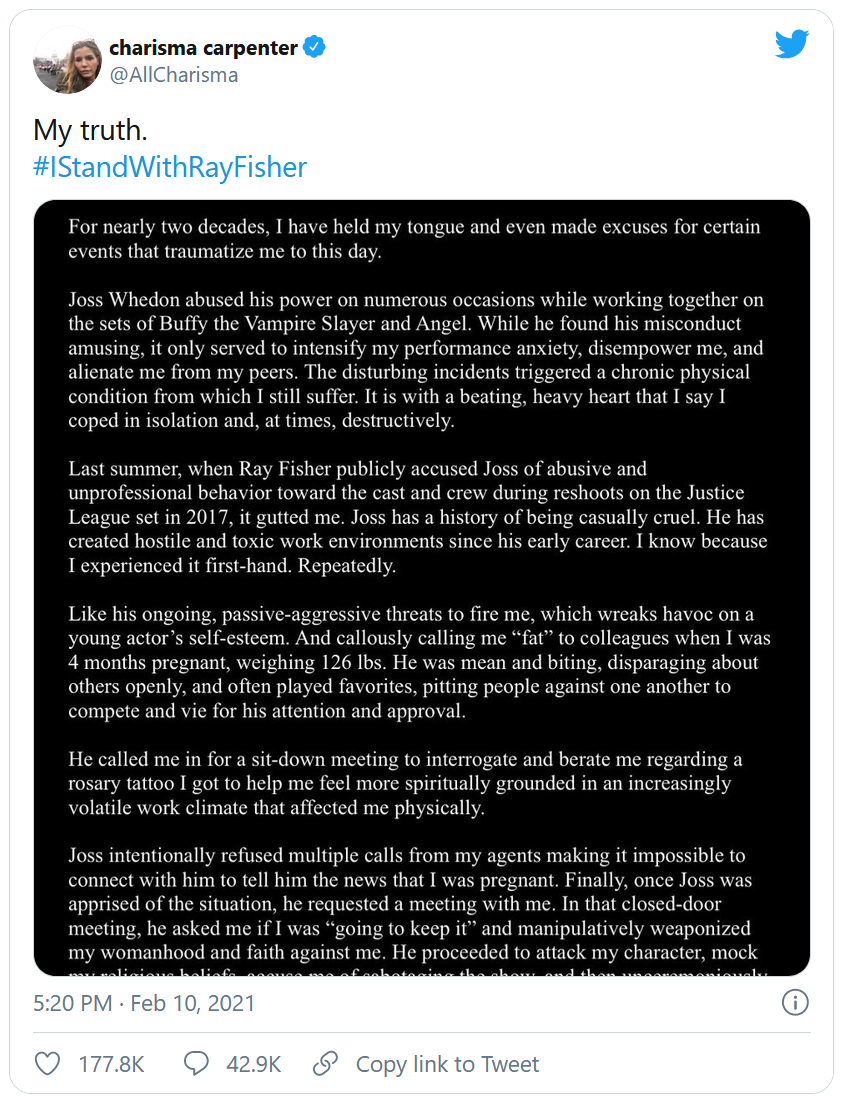 L'actrice évoque notamment le fait que lorsque Joss Whedon a appris sa grossesse, il l'a convoquée dans son bureau, et lui a demandé si elle comptait garder son enfant. Carpenter explique avoir continué à travailler avec le showrunner parce qu' "une partie [d'elle] cherchait toujours sa validation". Elle confie avoir "trouvé des excuses pour son comportement et [avoir] réprimé [sa] propre douleur".