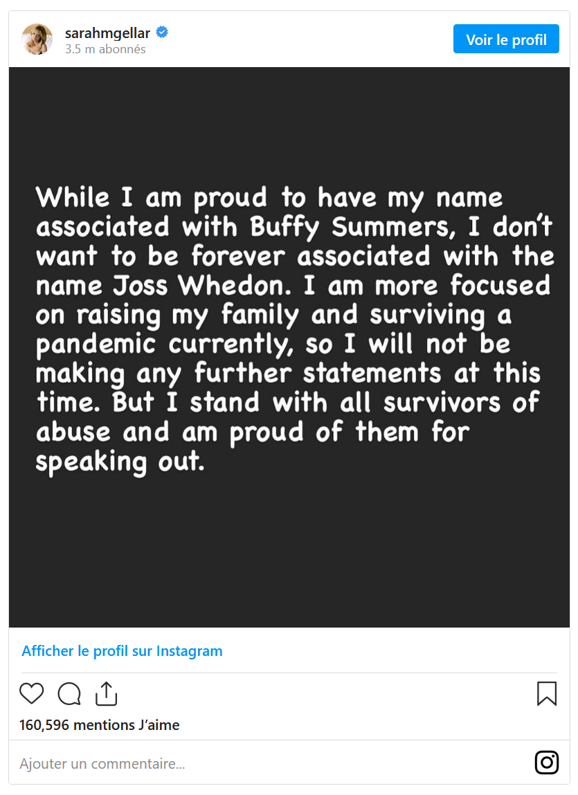 Si je suis fière de voir mon nom associé au personnage de Buffy Summers, je n'ai pas envie d'envie d'être associée pour toujours au nom de Joss Whedon. Je suis concentrée sur le fait d'élever ma famille et de survivre à la pandémie actuelle, donc je ne ferai aucune déclaration pour l'instant. Mais je soutiens toutes les victimes de harcèlement et je suis fière qu'elle parlent enfin.