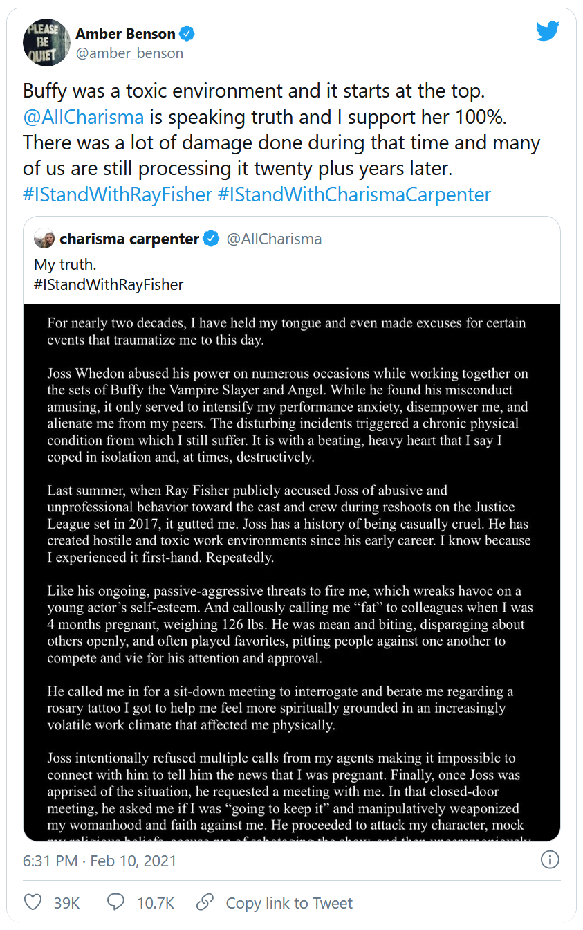 Buffy était un environnement toxique, et cela a commencé au sommet. Charisma Carpenter dit la vérité, et je la soutiens à 100%. Il y a eu beaucoup de dommages causés durant cette période, et nous sommes nombreux à continuer à en subir les conséquences vingt ans après.