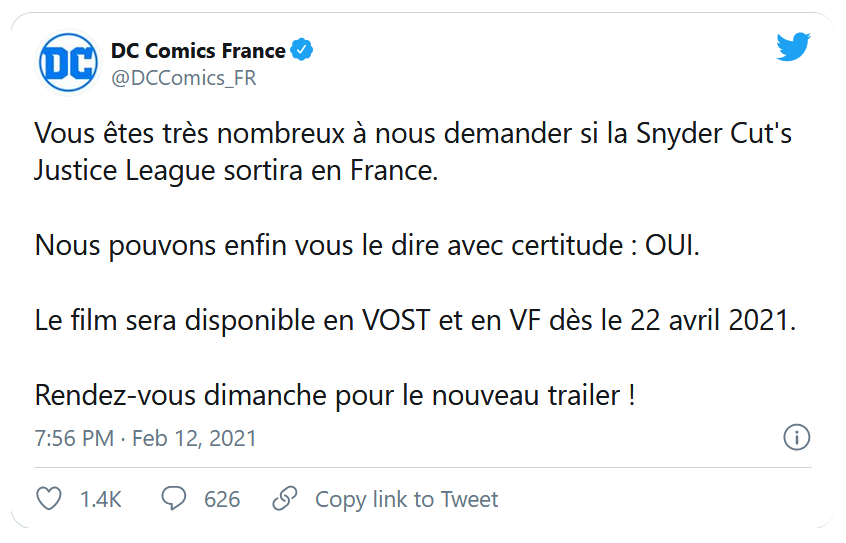 Les français devront-ils attendre le lancement hexagonal de HBO Max pour découvrir le Snyder Cut de Justice League ? Pour rassurer les fans, DC Comics France vient de révéler sur Twitter l'information que l'on attendait tous.