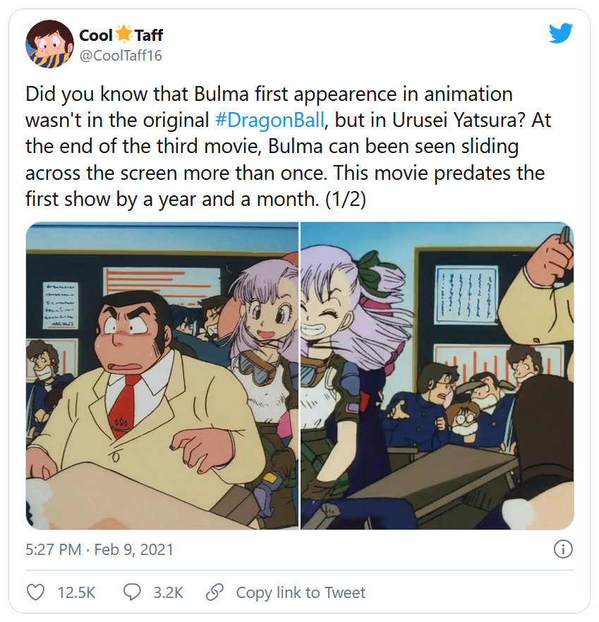 Bulma et Goku sont les deux premiers personnages aperçus dans Dragon Ball. Un duo débarqué rapidement car essentiel au bon déroulement de l'œuvre d'Akira Toriyama. Qui plus est, les deux protagonistes auraient pu entretenir une relation amoureuse, bien que l'idée ait été abandonnée par la suite. Bien qu'arrivée rapidement dans Dragon Ball, Bulma n'y a toutefois pas fait sa première apparition dans un anime. Comme le rapporte un internaute du nom de @CoolTaff16 sur Twitter, la première apparition à l'écran est dans un anime du nom de Urusei Yatsura, plus connu en France sous le nom de Lamu.