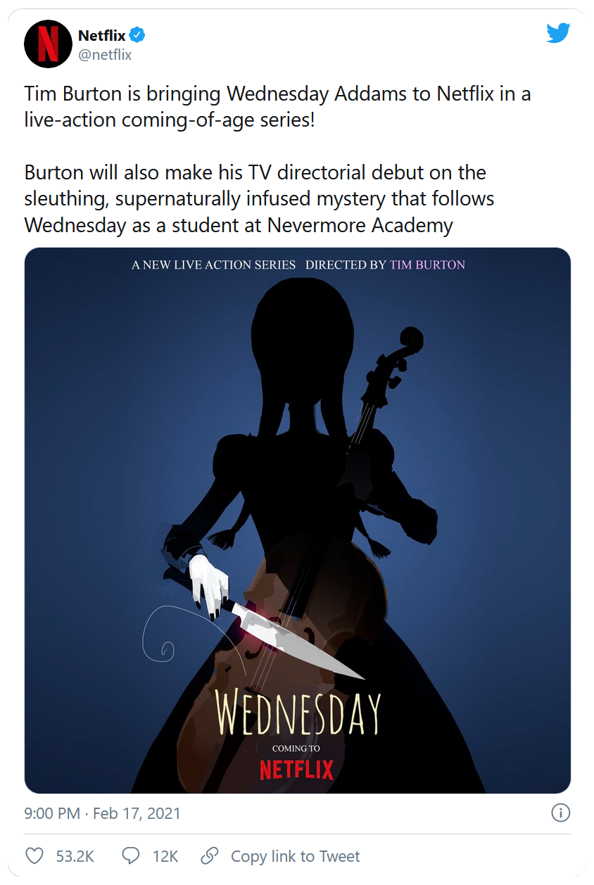 Engagée dans la guerre du streaming, la plateforme Netflix a décidé de mettre toutes les chances de son côté, en collaborant avec Tim Burton. Après avoir collaboré avec de grands cinéastes tels que David Fincher (House of Cards, Mindhunter, Mank), Martin Scorsese (The Irishman) et les frères Coen (La Ballade de Buster Scruggs), Netflix avait annoncé en fin d'année dernière sa première collaboration avec Tim Burton : une série TV inspirée de La Famille Addams.