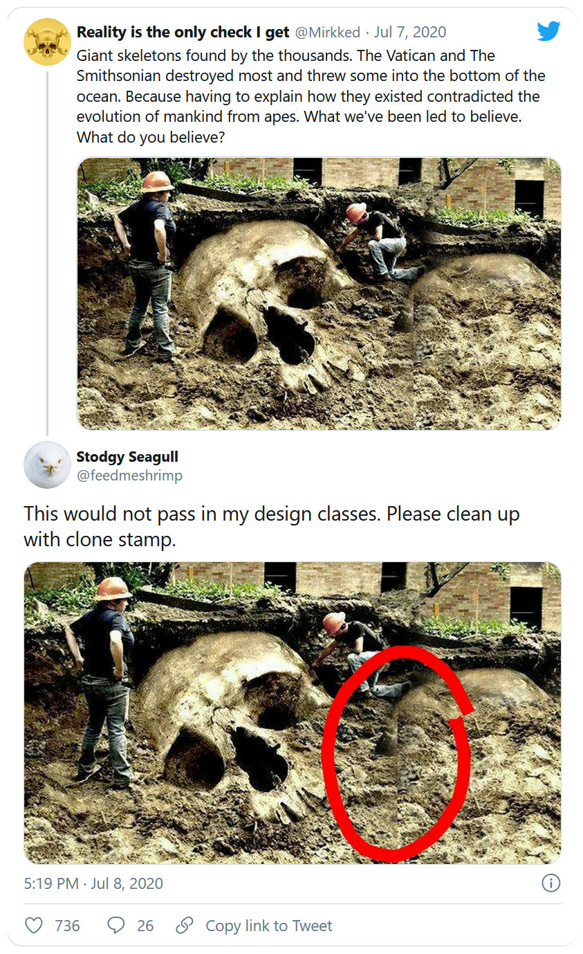 Malheureusement, avec les fausses informations, on ne sait jamais qui est le premier à l'avoir proférée, mais cela n'excuse pas tous les gens qui relayent l'information sans la vérifier. En l'occurrence ce tweet montre un montage photo d'un crâne de géant, acceptable pour les années 2000, mais en 2021, on s'attend quand même à mieux. Et pour cause, ces photos sont issues d'un concours PhotoShop de 2002, dont l'objectif était la création de fausses fouilles archéologiques.