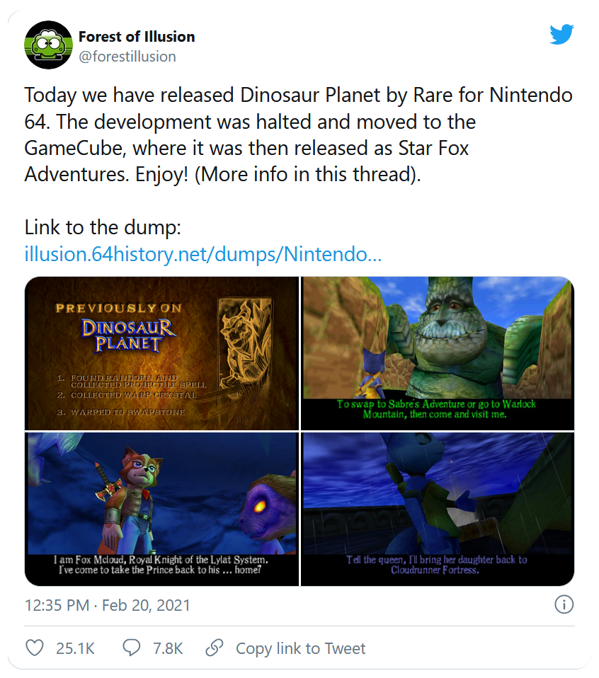 Aujourd'hui nous avons mis en ligne Dinosaur Planet par Rare pour Nintendo 64. Le développement a été arrêté puis a migré sur Gamecube, où il est finalement sorti sous le nom de Star Fox Adventures.