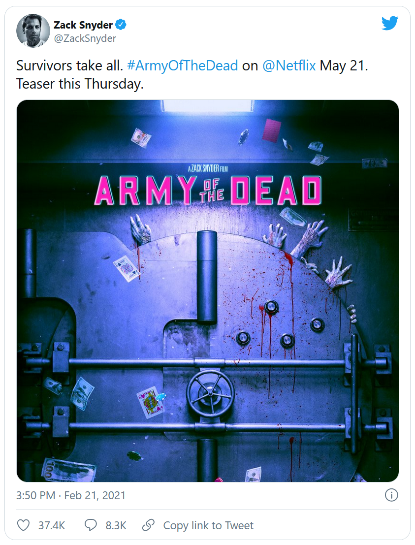 Zack Snyder l'a annoncé ce dimanche 21 février dans un tweet : son film L'Armée des morts sera disponible sur la plateforme Netflix dès le 21 mai prochain ! Une nouvelle bande-annonce sera également révélée ce jeudi 25 février.