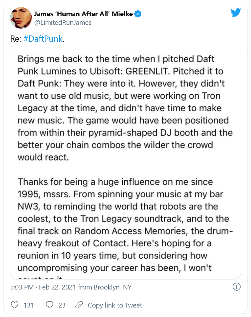 Daft Punk, l'iconique duo de DJ français, a récemment annoncé sa séparation, après une collaboration de 28 ans, dans une vidéo baptisée Epilogue. A ce propos, les fans n'ont pas manqué de réagir sur Twitter. Parmi eux, un certain James Mielke - anciennement producteur chez Q Entertainment - a posté un message sur Twitter, laissant entendre qu'un jeu en collaboration avec les artistes était à l'étude à cette époque. Explications.
