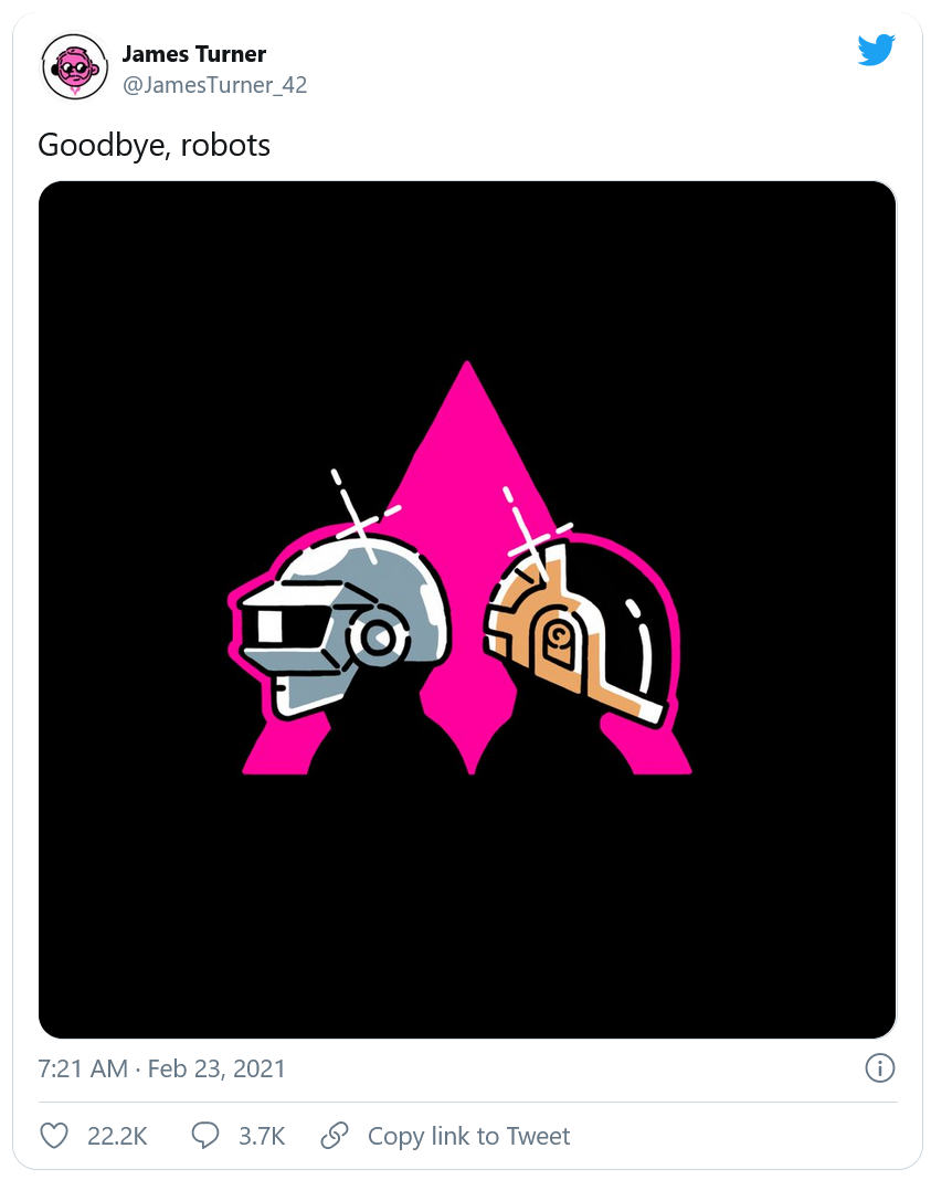 La séparation des Daft Punk n'en finit plus de faire réagir les internautes. Et pour cause : les hommages se multiplient, à croire qu'ils sont décédés. Nous vous présentions récemment un projet de jeu vidéo dévoilé par un ancien de chez Q Entertainment qui n'a malheureusement pas pu voir le jour. Aujourd'hui, c'est au tour de James Turner - directeur artistique de Pokémon Epée / Bouclier - de rendre hommage a l'iconique duo français.
