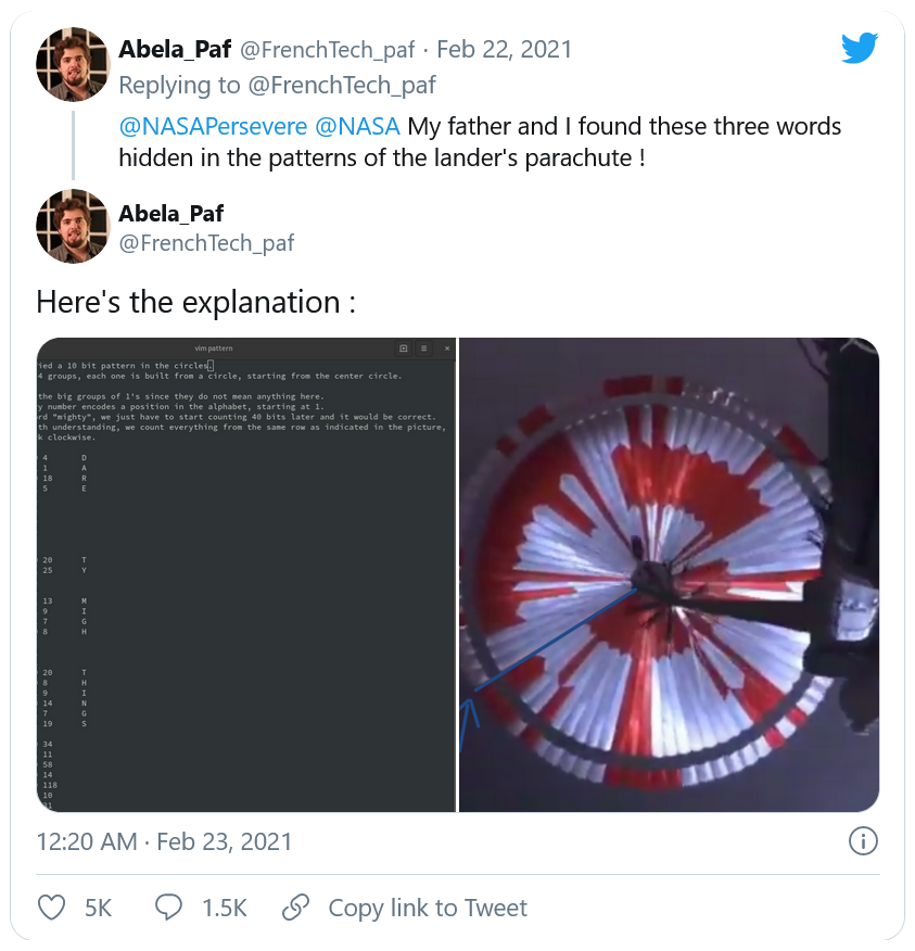 Après avoir dévoilé une vidéo unique de l'atterrissage de Perseverance sur Mars, voilà que la NASA remet le couvert, cette fois-ci avec un message crypté à l'intérieur du parachute du robot. Les petits malins se sont ainsi amusés à cacher un easter egg dans le cadre de cette spectaculaire mission d'exploration de la planète Mars. Il n'aurait fallu que quelques heures à la communauté de détectives internautes pour résoudre l'énigme. Explications dans cet article.