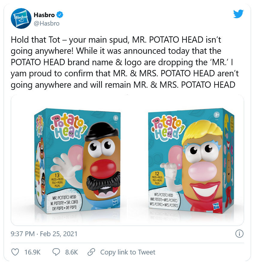 Le jouet en question compte donc lâcher son titre de civilité pour ne garder que le "Patate". Une nouveauté qui vise à refléter davantage les nouvelles identités de genre ainsi que la société moderne dans laquelle nous vivons. Suite à ce changement, les joueurs pourront concevoir leurs familles de patates avec des parents de même genre mais également changer à foison les genres et jouer avec les normes. Chaque boîte comprendra deux corps larges et un plus petit, ainsi que 42 accessoires.