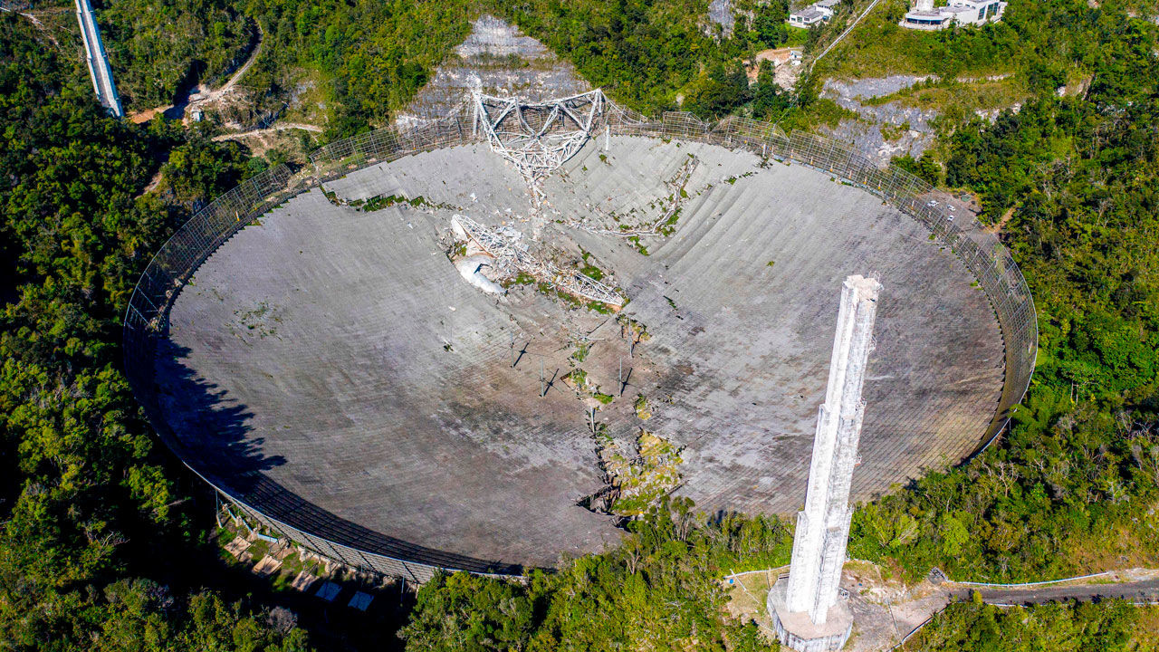 La plate-forme scientifique massive du télescope, qui pesait 900 tonnes, était suspendue au-dessus de la vaste parabole radio par trois douzaines de câbles de soutien. Mais en août 2020, l'un de ceux les câbles ont glissé hors de sa prise; avant que la panne puisse être réparée, un deuxième câble s'est cassé carrément en novembre. La National Science Foundation (NSF) des États-Unis, propriétaire du site, a déterminé que la plate-forme était trop instable pour être réparée en toute sécurité et a décidé de mettre l'instrument hors service. Avant que cela puisse arriver, le télescope effondré seul le 1er décembre.