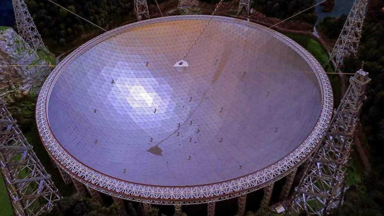 Le deuxième plus grand radiotélescope du monde, à l'observatoire d'Arecibo à Porto Rico, a été détruit lorsque sa plate-forme de récepteur suspendue de 900 tonnes s'est détachée et a plongé à 140 mètres (450 pieds) sur l'antenne radio ci-dessous.