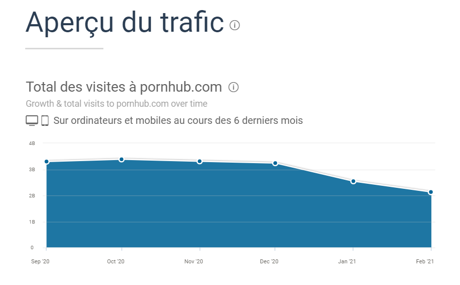Selon les données récoltées par SimilarWeb, le trafic des connexions sur un site comme Pornhub est en chute depuis le mois de décembre 2020. Vous pouvez observer ce graphique, très parlant :