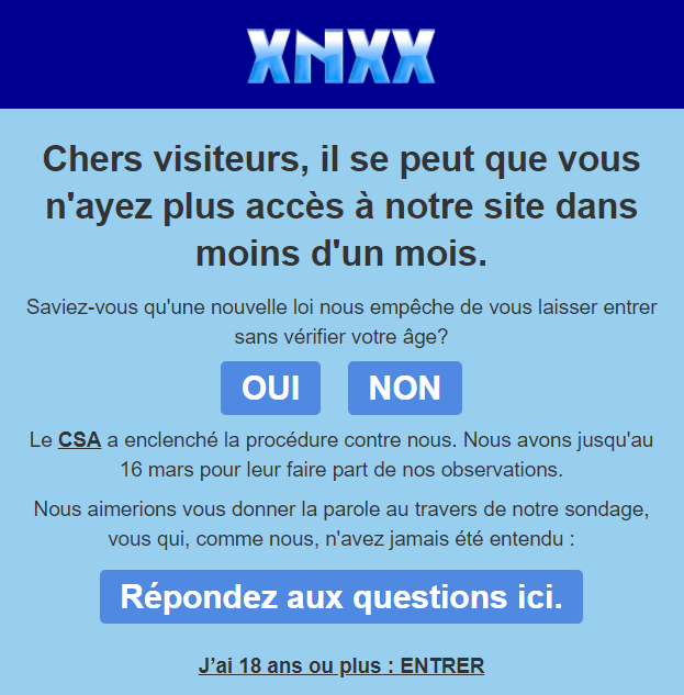 Tous les sites qui ne respectent pas cette nouvelle loi seront bientôt mis en demeure, et une procédure de blocage du référencement et de l'accès à ses sites internet sera lancée, à défaut d'un retour satisfaisant de leur part sous quinze jours. Les associations pour la protection de l'enfance se sont ainsi mobilisées pour que les choses se mettent en place le plus rapidement possible. De ce fait, il est déjà possible de lire sur certains sites internet pour adultes des notes informatives de ce genre :