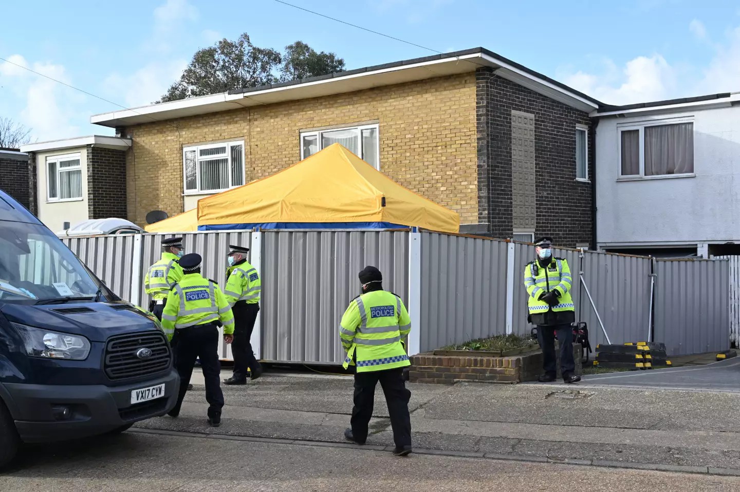 Des policiers devant des barrières dans une maison à Deal, dans le sud-est de l'Angleterre, le 12 mars 2021, alors que les agents poursuivent la recherche de preuves en relation avec le meurtre de Sarah Everard.