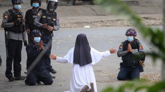 Elle n'a aucun compte sur des réseaux sociaux, mais les images de son geste, hautement téméraire, ont fait le tour du monde : en plein milieu d'un affrontement entre manifestants et forces de l'ordre, Sœur Ann Roza Nu Thawng est allée au-devant d'un contingent de militaires, casqués et armés, et elle s'est mise à genoux, les deux mains jointes, leur criant de ne pas tirer.