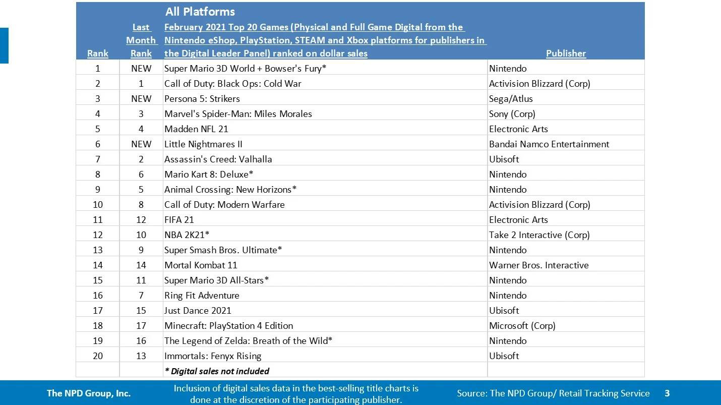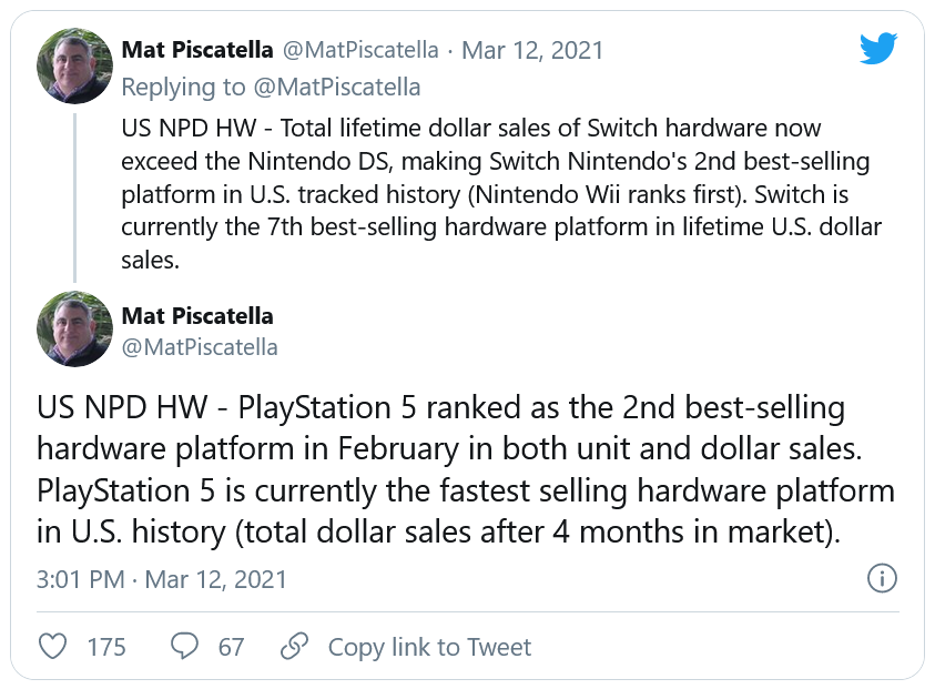 La Switch reste la console la plus vendue depuis désormais 27 mois consécutifs. À l'opposé, Sony a annoncé avoir distribué 4,5 millions d'exemplaires de PS5 entre le 12 novembre et le 31 décembre 2022. Rien que sur le mois de février 2021 aux États-Unis, la vente de consoles, d'accessoires et de contenus a généré près de 4,6 milliards de dollars. soit une hausse de 39% par rapport à février de l'année dernière.