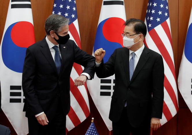 Le secrétaire d'Etat américain, Antony Blinken, et le ministre sud-coréen des affaires étrangères, Chung Eui-yong, à Séoul, jeudi 18 mars.