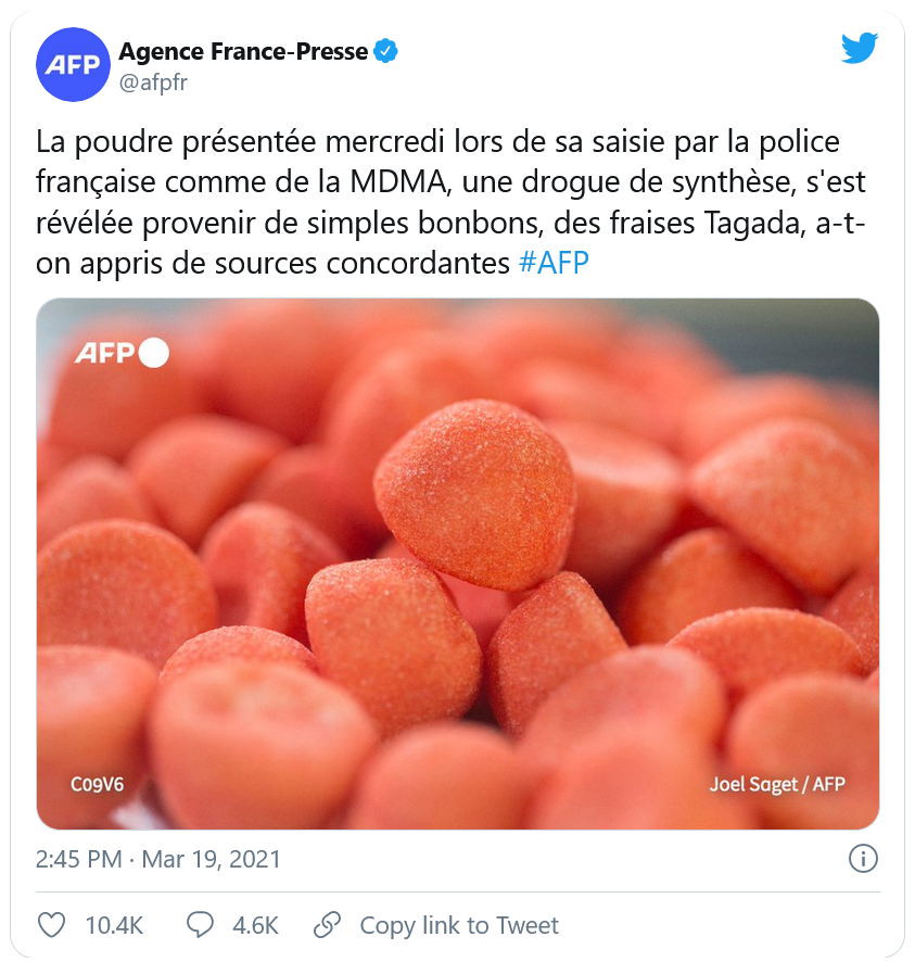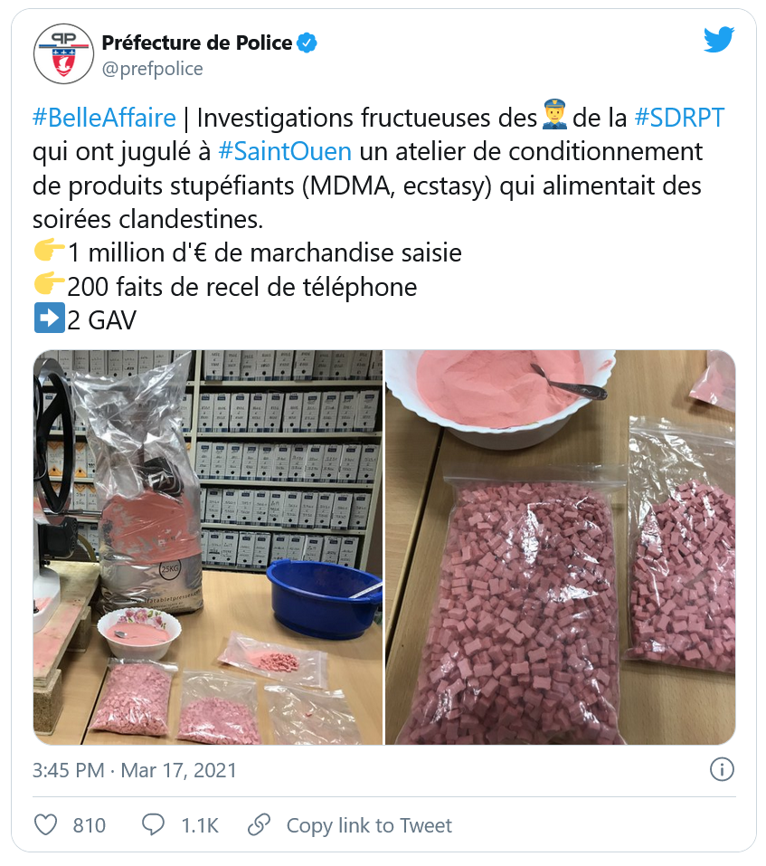 Les faits, rapportés par l'AFP, remontent au mercredi 17 mars, lorsque la Police Nationale confirme la saisie d'une drogue de synthèse (MDMA) à Saint-Ouen, en Seine Saint-Denis. Fière de ce haut-fait, la Préfecture de Police de Paris avait annoncé la nouvelle sur Twitter (la publication n'a toujours pas été supprimée) :