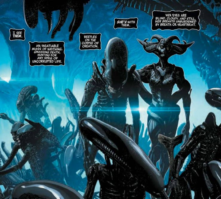 Quelques planches de ce premier numéro ont été publiées, et l'une d'entre elles attire l'attention des fans de la licence. En effet, on y voit une horde de Xénomorphes, dont l'un presque anthropomorphique et de sexe féminin. Serait-ce elle, la fameuse Xénomorphe Alpha ? Tout porte à le croire, puisque le narrateur prend le temps de la décrire, spécifiquement.