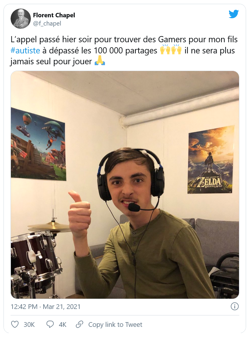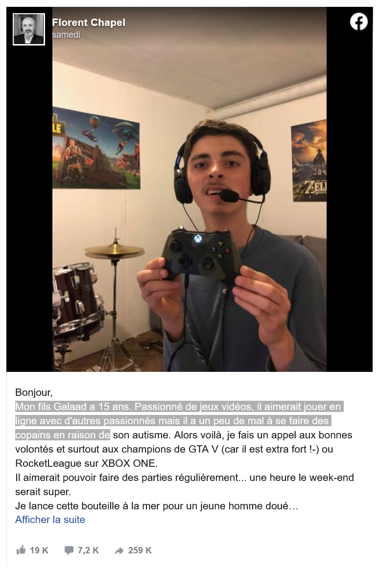 Co-président d'Autisme Info Service, Florent Chapel est père d'un jeune autiste de 15 ans du nom de Galaad. Passionné de jeux vidéo, le jeune homme est un adepte de GTA V et Rocket League. Problème : son autisme le freine. Il ne parvient pas à se faire d'amis pour jouer à ses côtés sur Xbox One. Pour lui venir en aide, son père a publié un premier message sur Facebook, invitant les passionnés souhaitant passer un peu de leur temps libre à jouer en compagnie de son fils à le contacter. Une bouteille à la mer qui aura suscité un engouement monstre : plus de 243 000 partages en quelques heures.