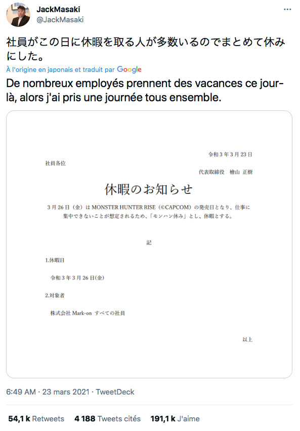 Jack Masaki, le PDG du studio de réalité Virtuelle Mark-On, situé au Japon, et plus précisément à Tokyo, a officiellement annoncé que la journée du vendredi 26 mars 2021 serait fériée pour tous ses employés. Jack Masaki souhaitait que ses employés puissent profiter de la sortie de Monster Hunter Rise sans avoir besoin de feindre la maladie. Jack a ainsi déclaré :