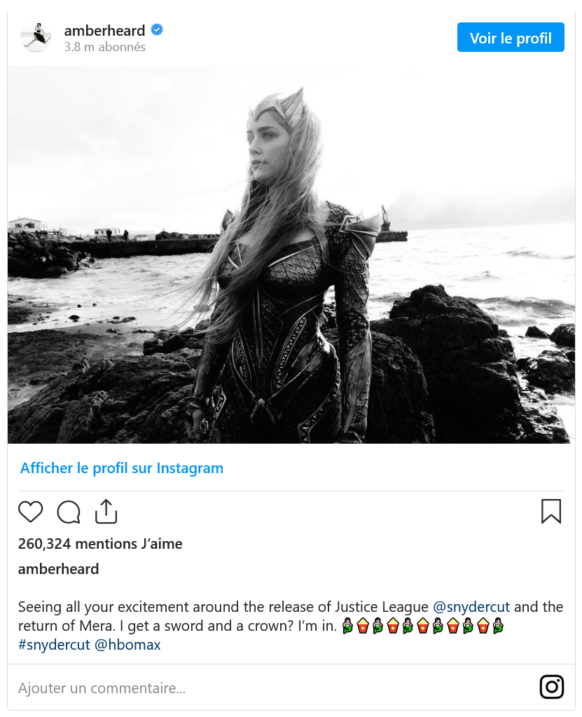 Sur Instagram, l'actrice américaine a partagé une photo en noir et blanc d'elle-même dans le costume de Mera accompagnée de la légende suivante :