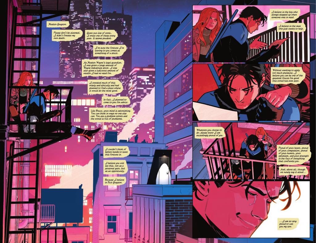 Les révélations sont faites dans le dernier numéro DC comics Nightwing #78. Tout se passe à la mort d'Alfred Pennyworth, le majordome de Bruce Wayne. Le personnage dont il est question aujourd'hui, Nightwing, n'était pas présent à la lecture de son testament. C'est Barbara Gordon qui lui apprend les nouvelles qui suivent : deux informations importantes : Alfred était AUSSI un milliardaire. Il laisse toute sa fortune à Dick Grayson, alias Nightwing.