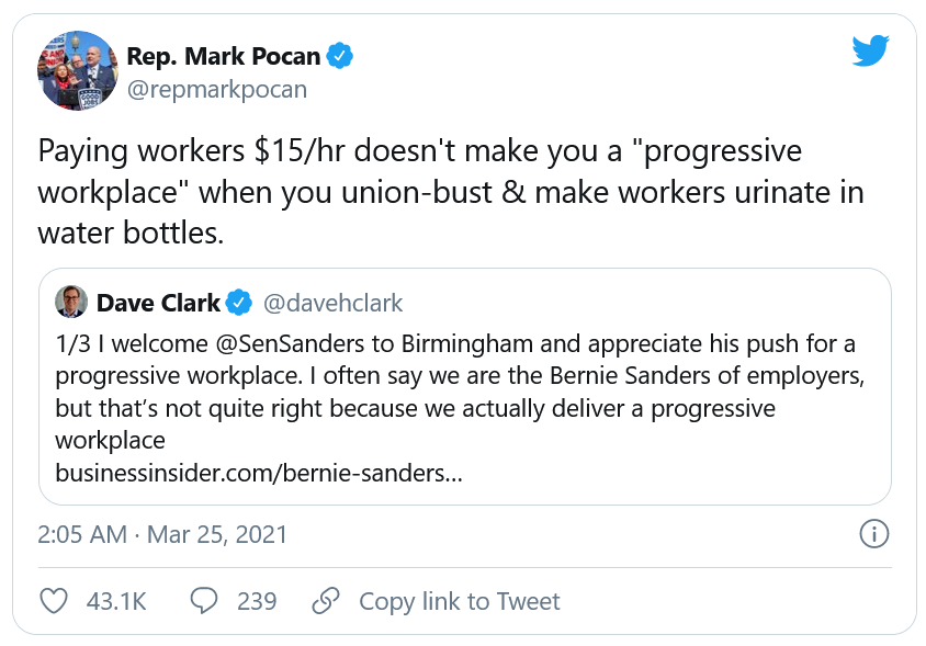 Payer vos employés 15 dollars de l'heure ne fait pas de vous une "entreprise progressiste", quand vous les faîtes uriner dans des bouteilles d'eau.
