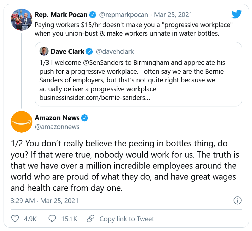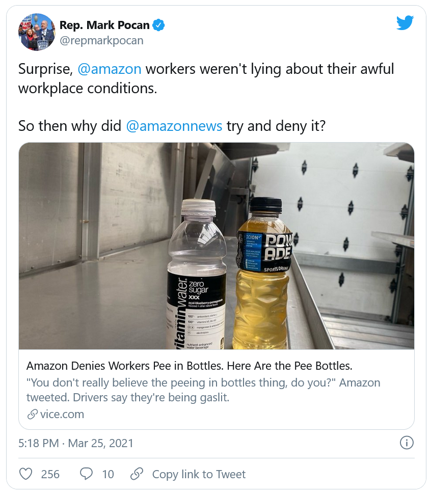L'entreprise, qui emploie près d'un million de personnes dans le monde, a récemment reconnu que ses employés étaient contraints d'uriner dans des bouteilles en plastique. Ces révélations ont été faites à la suite d'un tweet, datant du 25 mars 2021, vilipendant l'entreprise basée à Seattle, écrit par un élu du parti démocrate américain, du nom de Mark Pocan.