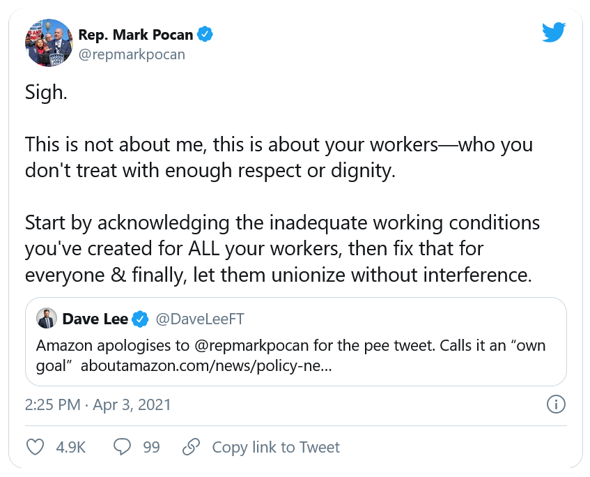 Nous devons des excuses au Représentant Pocan. [...] Le tweet était incorrect. Il ne prenait pas en compte notre grand groupe de chauffeurs, et se concentrait à tort sur nos centres de distribution. Un centre de distribution Amazon typique dispose de dizaines de toilettes, et les employés peuvent s'éloigner de leur poste de travail pour s'y rendre à tout moment. [...] Nous savons que les chauffeurs peuvent et ont du mal à trouver des toilettes à cause de la circulation ou des routes de campagne, et ce fut particulièrement le cas durant la période du Covid-19, du fait de la fermeture des toilettes publiques.