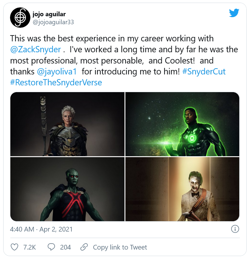 Travailler avec Zack Snyder a été ma meilleure expérience professionnelle. Cela fait longtemps que je travaille, et il a été, de loin, le plus professionnel, le plus charmant et le plus cool. Merci à @jayoliva1 de m'avoir présenté à lui. #SnyderCut #RestoreTheSnyderVerse