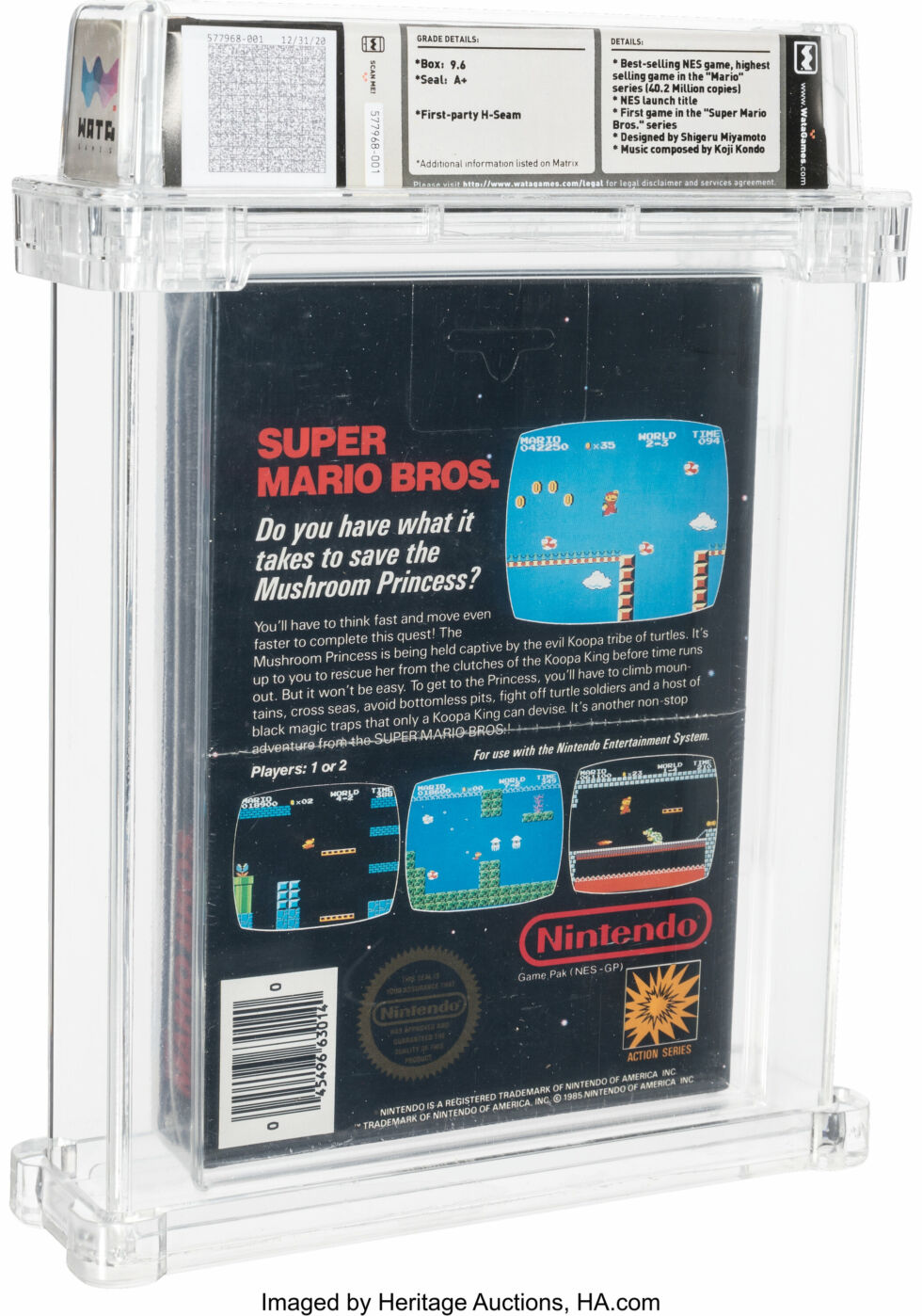 Cette cartouche de Super Mario Bros. s'est envolée à 660 000 dollars l'équivalent de 560 000 euros ! Soit plus de quatre fois le prix du précédent record établi en novembre dernier. Ainsi, la cartouche en question détient aujourd'hui le record du jeu vidéo le plus cher du monde.