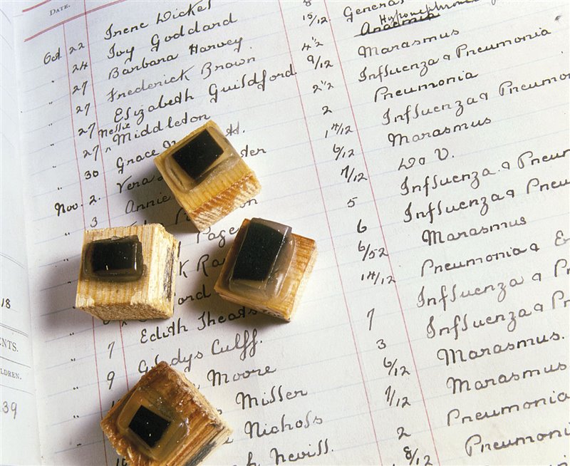 Les biologistes de l'hôpital de St. Bartholomew à Londres analysent les tissus cérébraux et pulmonaires des victimes de la pandémie de 1918 dans le cadre des efforts mondiaux pour mieux appréhender le virus. Ici, une liste de noms d'enfants qui ont été victimes de la grippe en 1918.