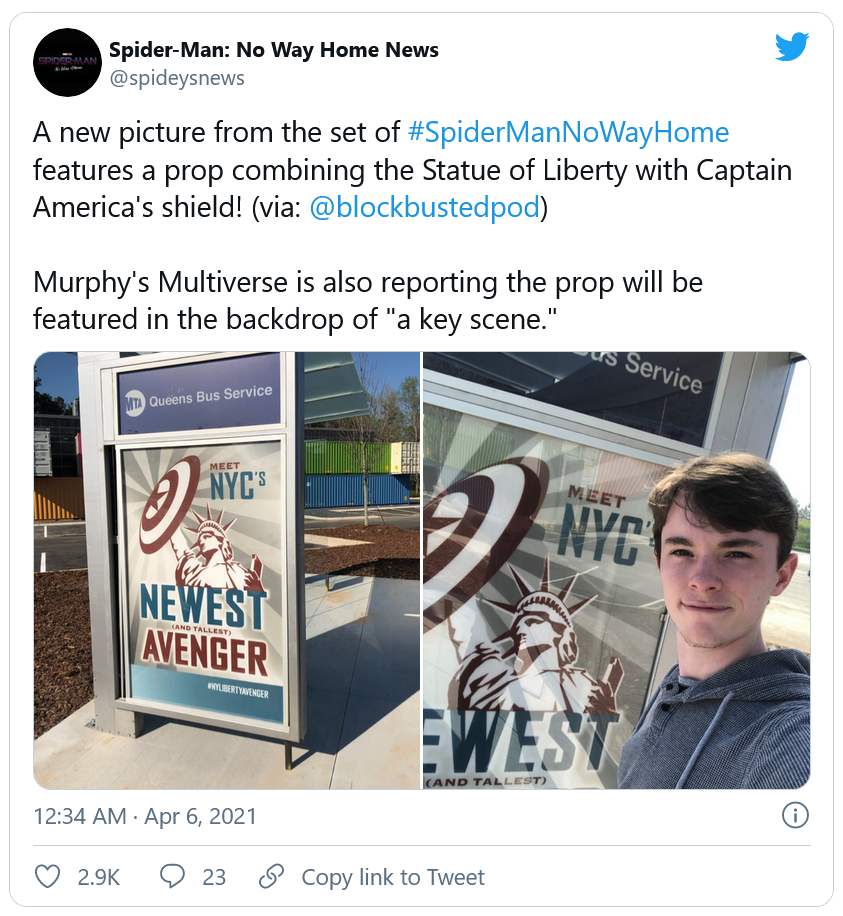 Comme vous pouvez le constater, il s'agit d'un faux panneau publicitaire sur lequel on voit la statue de la Liberté portant le bouclier de Captain America, surnommée "Newest and tallest avenger" (soit "le plus récent et le plus grand des Avengers"). Etant donné que nous supposons pour le moment que No Way Home se déroule à peu près un an après la défaite de Thanos, cela voudrait dire que l'équipe de super-héros reste bel et bien présente dans la phase 4 du MCU. Concernant le personnage qui est représenté sur cette affiche, les hypothèses vont bon train. Certains affirment qu'il s'agit de John Walker, le plus récent Captain America (même si cela semble peu probable), quand pour d'autres, il s'agit de Falcon, voire même d'un tout nouvel Avenger encore inconnu au bataillon. Il s'agit en tout cas d'un élément de propagande intéressant à analyser.