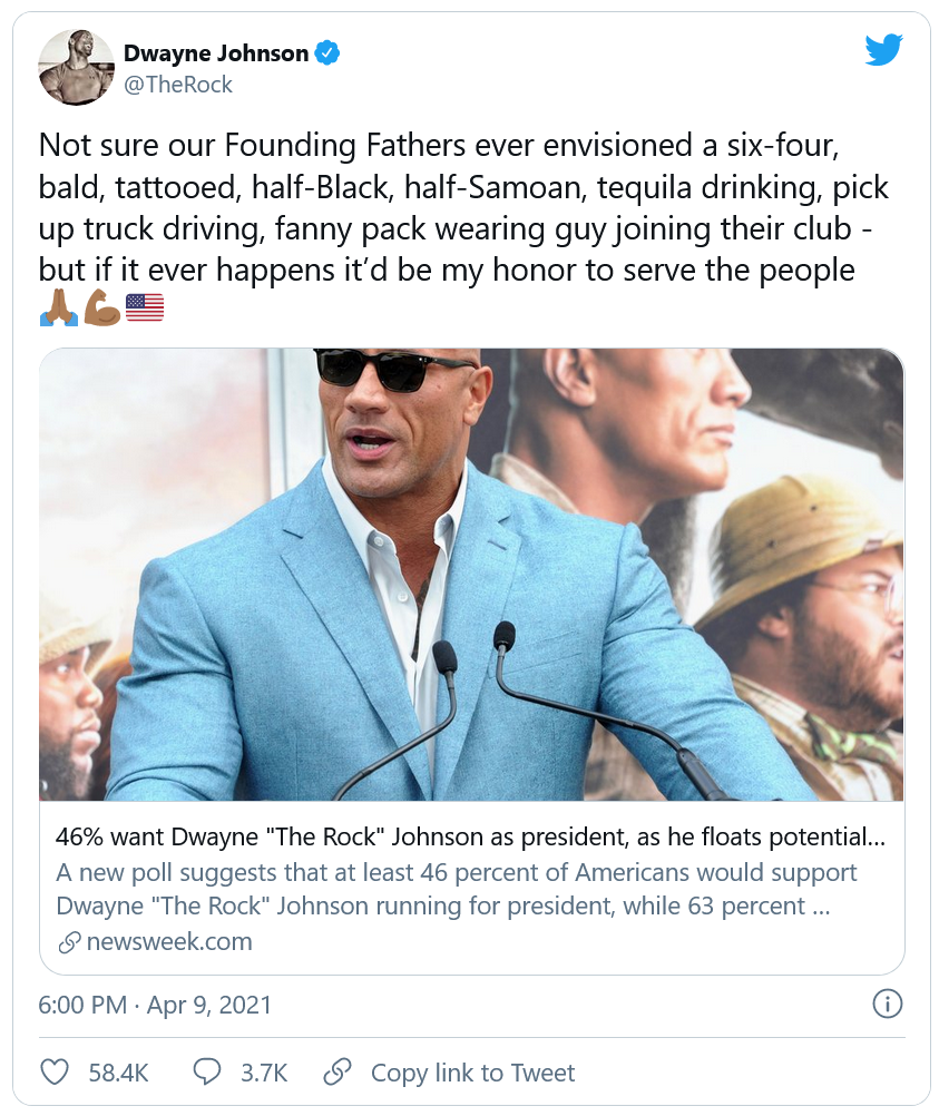 Aux côtés de Kanye West ou, plus récemment de Will Smith, The Rock s'est souvent exprimé au sujet de son intérêt pour le poste de président des Etats Unis. Ce n'est d'ailleurs pas la première fois que la star des films Fast and Furious fait référence à une candidature pour 2024.