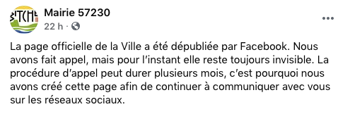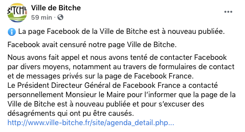 Concernant la ville de Bitche, la nouvelle vient tout juste de tomber : Facebook France s'est excusé du désagrément, et la page Facebook de la ville a pu être récupérée.