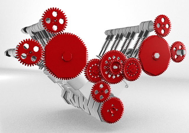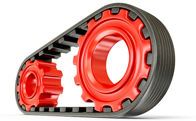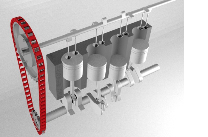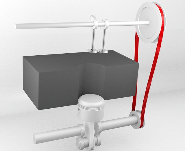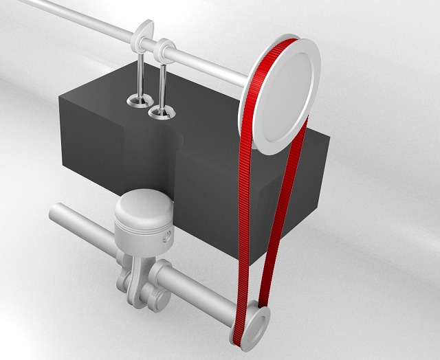 Moins résistante, elle doit être changée régulièrement (le fait qu'il n'y ait qu'un seul cylindre sur l'image n'a pas d'importance sur la logique de fonctionnement). Son avantage est d'être très légère (consommation réduite) et le fait qu'elle doive être remplacée impose un minimum de contrôle (ce qui est plutôt bien vu l'importance de l'organe. Avec une chaîne, on a tendance à être laxiste).