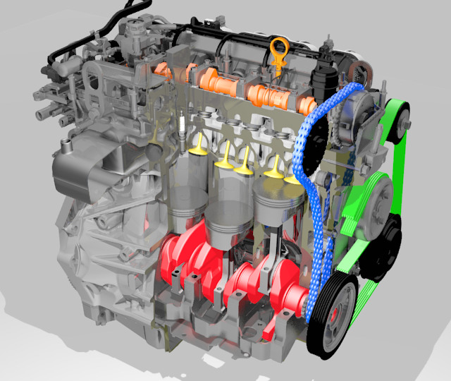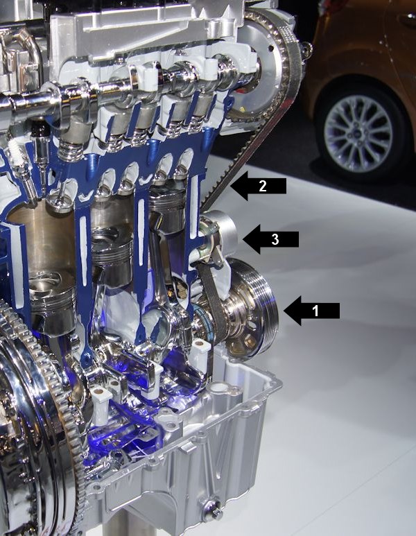 Voici un moteur qui met en évidence les éléments qui nous intéressent. Il s'agit ici d'une chaine de distribution (en bleu) qui n'est pas à confondre avec la courroie accessoire que j'ai mise en vert.