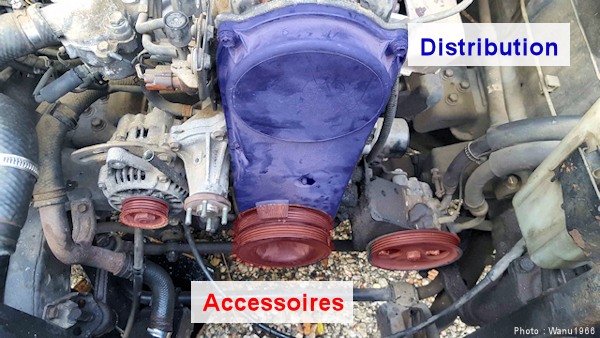 Un amateur peut vite confondre la courroie accessoire avec la distribution. Pour les reconnaître : la distribution est crantée, celle de l'accessoire ne l'est pas comme vous pouvez le voir. De plus, elle n'est pas très protégée et reste visible d'un simple coup d'oeil dans le compartiment moteur. La distribution est protégée (donc cachée) car elle est vitale.