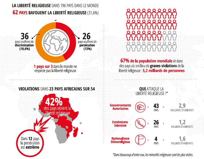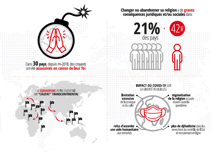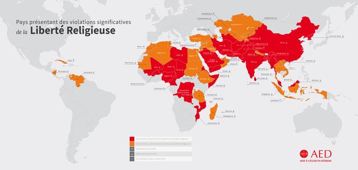 Le rapport 2021 sur la liberté religieuse pointe des «violations notoires» de ce droit fondamental dans 62 pays parmi les 196 étudiés - soit un pays sur trois, contre un sur cinq lors de la précédente édition de 2018. Parmi ces pays, 26 sont répertoriés au titre de persécution, et 36 au titre de discrimination.