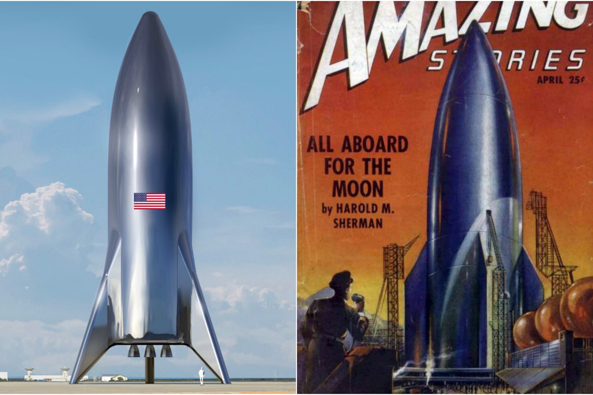 A gauche, une illustration de Starship; à droite, une couverture du magazine de science-fiction Amazing Stories.
