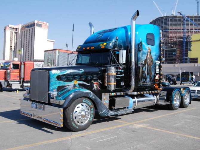 Le camion américain se distingue des camions européens par son capot énorme , proéminent souvent décoré ou peint avec des motifs aux couleurs vives et rutilantes rappelant de façon ostentatoire les mythes et symboles de l' Amérique.