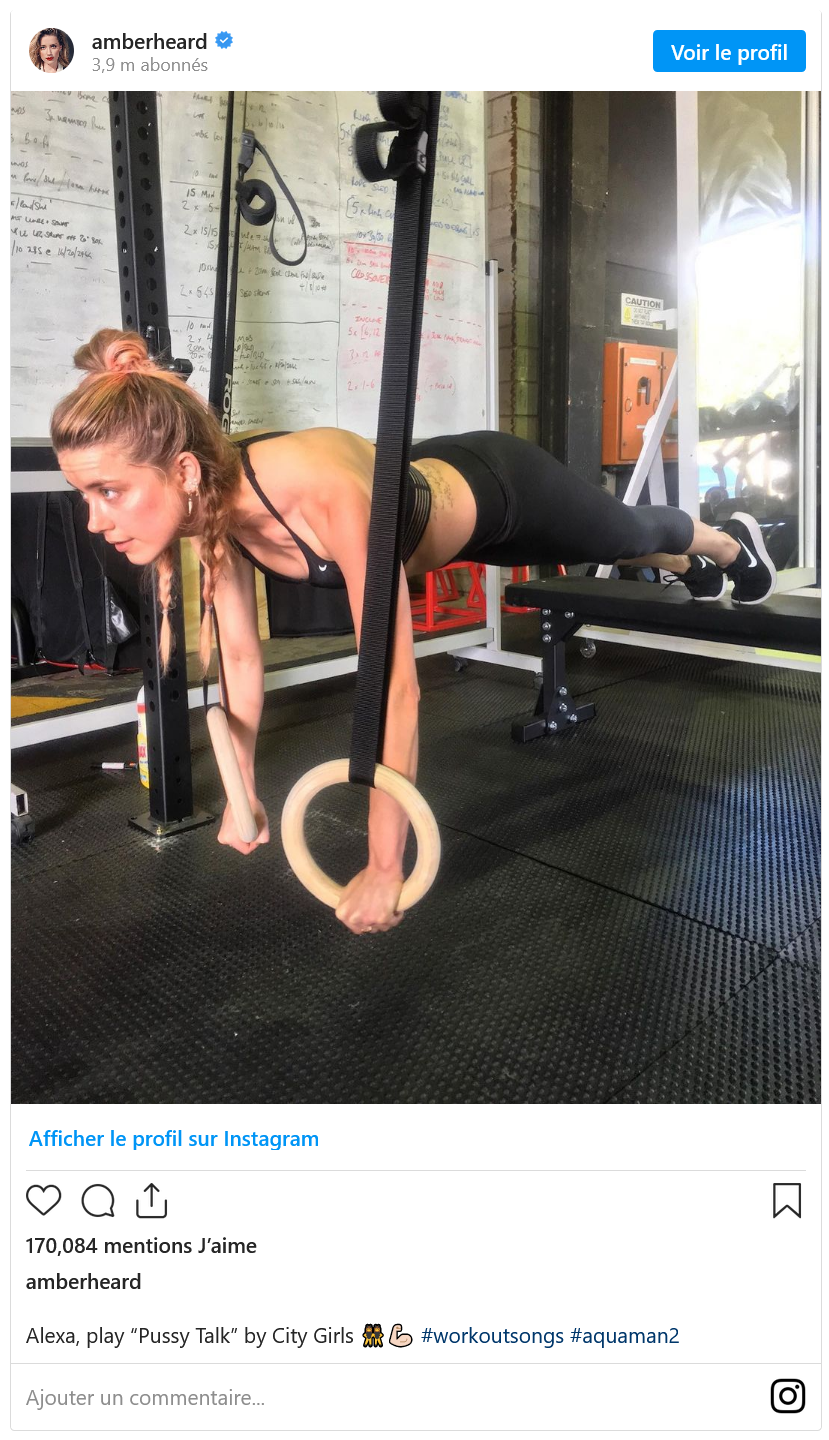 Aujourd'hui, c'est Amber Heard qui affiche sur les réseaux ses séances de sport. Hier, l'interprète de Mera dans Aquaman a posté sur son compte Instagram cette première photo en guise de teasing pour sa reprise du rôle dans le second opus.