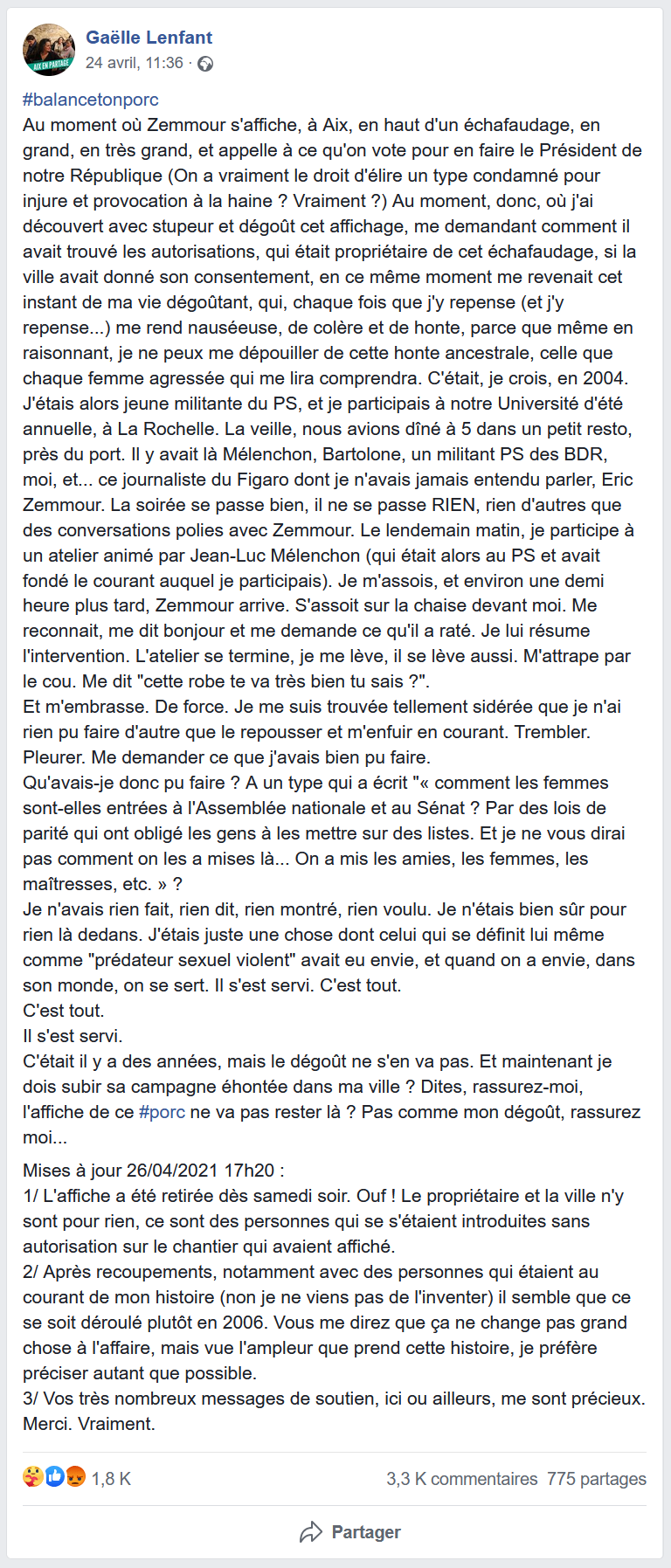 Un épisode que Gaëlle Lenfant n'a jamais oublié : "Il s'est servi. C'était il y a des années, mais le dégoût ne s'en va pas. Et maintenant je dois subir sa campagne éhontée dans ma ville ? Dites, rassurez-moi, l'affiche de ce #porc ne va pas rester là ? Pas comme mon dégoût, rassurez moi..."