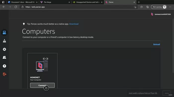 Pour mener à bien sa petite expérience, The Verge a donc utilisé l'appli de bureau Parsec, que le journaliste a pu télécharger via le navigateur de Microsoft.