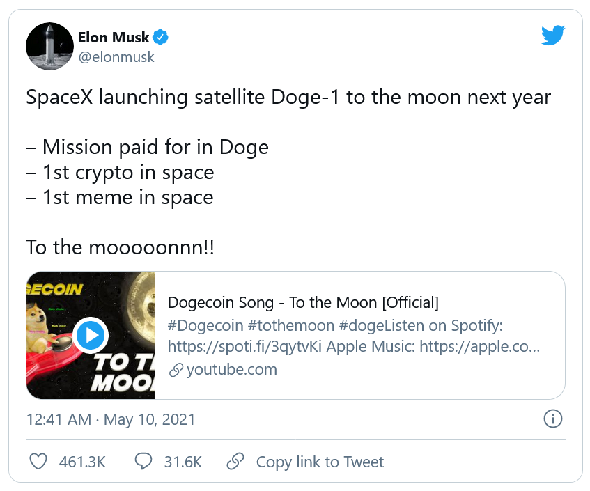 En collaboration avec l'entreprise Geometric Energy Corporation, Space X a pour ambition le développement d'un satellite appelé Doge-1, dont le décollage est prévu début 2022 en direction de la Lune. Une mission payée en intégralité grâce au Dogecoin, et qui a vocation à obtenir des informations sur le satellite naturel de la Terre.