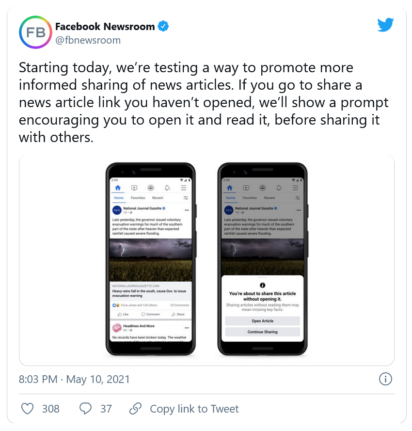 En juin 2020, Twitter avait adopté une mesure similaire. Récemment, le célèbre réseau social a posté des données sur l'impact de la fenêtre contextuelle sur le comportement des utilisateurs. D'après l'entreprise, cette fonctionnalité aurait conduit les utilisateurs à ouvrir les articles 40 % plus souvent et aurait contribué à ralentir la vitesse de propagation des fausses informations.